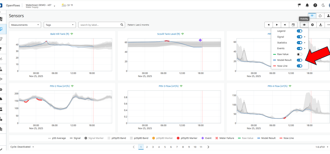 The user can also directly check hydraulic model results directly through the sensor graphs under Network Monitoring dashboard, both in the overview page, sensor detail page or when using the comparison graphs. To see model results when navigating in the overview or sensor detail graphs, make sure to turn on Model result under the visibility setting located on the top of the graphs (see above).
