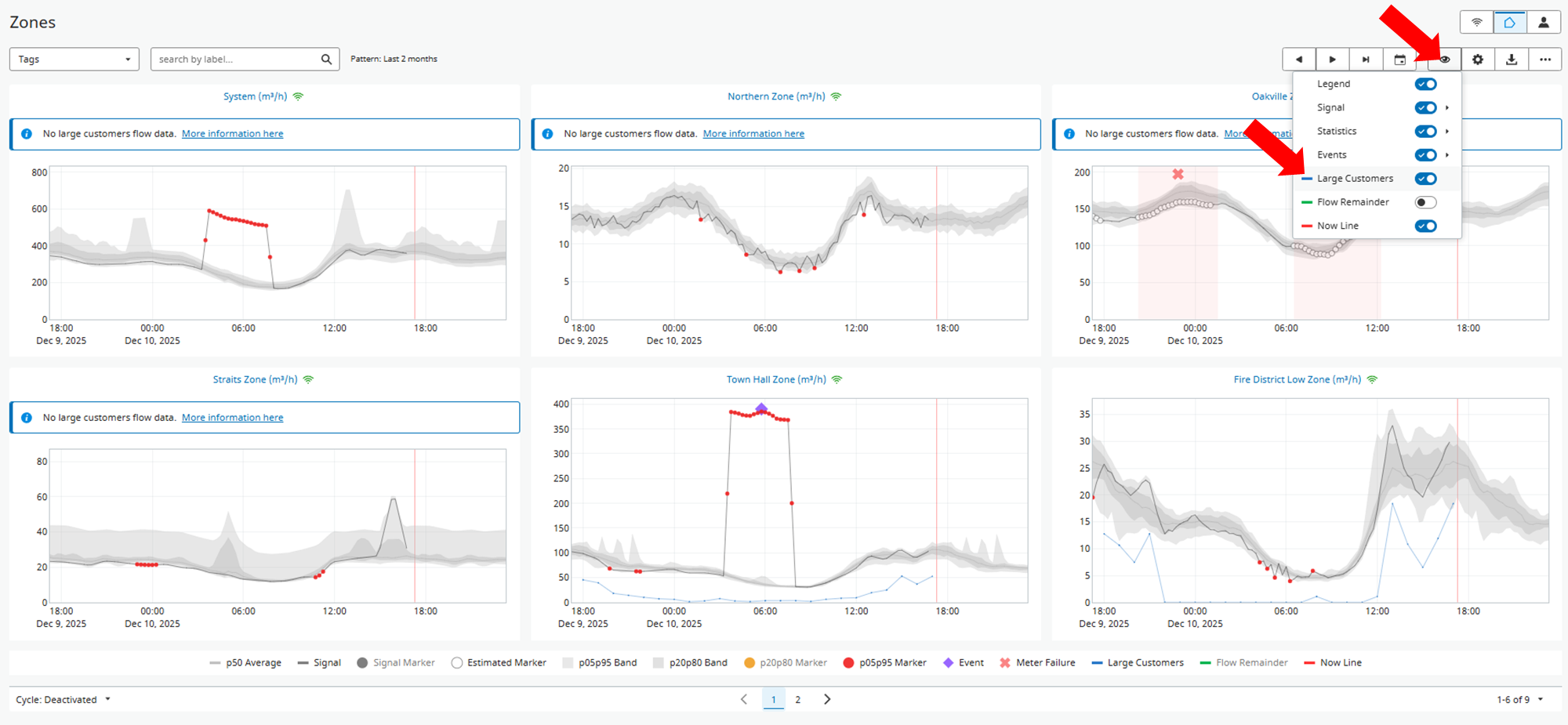 The total large customer flow can be obtained by summing each individual smart meter belonging to a specific zone and be displayed directly on the zone graph. By default the total large customer flow is disabled, but the user can enable it from the Zone overview page or zone detail graph page, by clicking on the visibility button and enabling large customer flow, which will be represented with a blue line (check figures below).