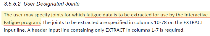 In SACS, the EXTRACT input is used to specify joints for which fatigue data is to be extracted for use in the Interactive Fatigue program. The joints are defined in columns 10–78 of the EXTRACT line, with a corresponding header line containing only EXTRACT in columns 1–7.