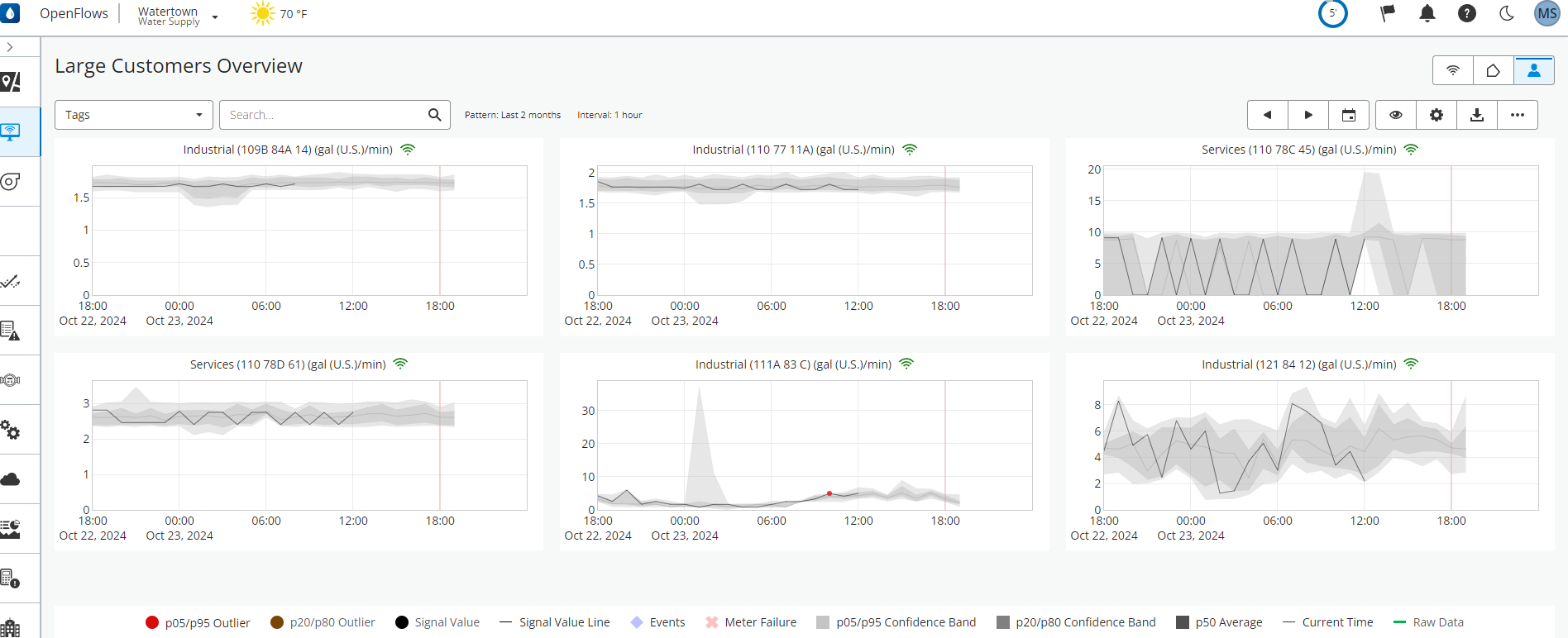 The Large Customer Overview pages show side by side graphs of every large customer sensor (configured in the Smart Meter Administration page). The main goal is to provide an at-a-glance indication if "patterned" variables lie within the expected range of values​. Particularly useful to quickly spot any anomalies at the large customer level (that can represent internal eaks, anomalous decreases in consumption, etc) in real time.