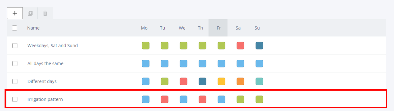 Some other use cases can be for example distinguishing between days with irrigation and days without irrigation. For example imagine that for a specific area irrigation occurs at each Monday, Wednesday and Friday. In that case we could setup a pattern like below: