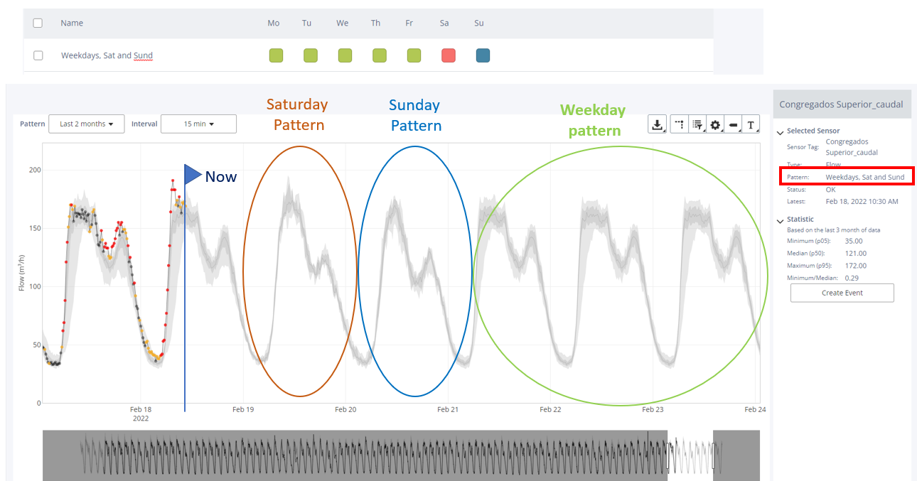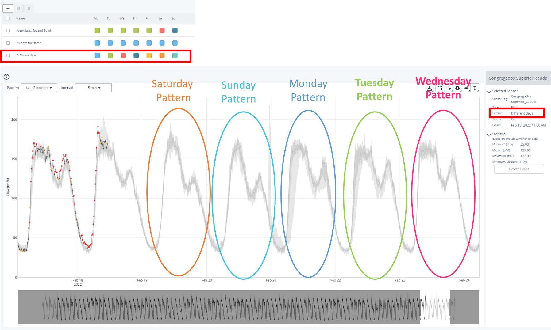 User can customize how patterns are computed in WaterSight by creating different group days. The default is a weekday pattern (that uses past days from Monday to Friday to calculate a pattern), a Saturday pattern (that uses only past Saturdays to calculate a pattern) and a Sunday pattern (that uses only past Sundays to calculate a pattern), as exemplified in Figure below.