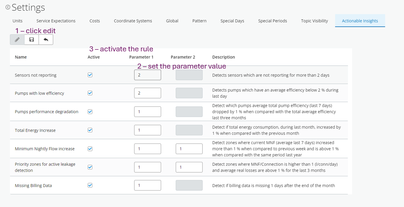 To edit a parameter or to enable one of the rules, the user should first click in the edit button above the table.