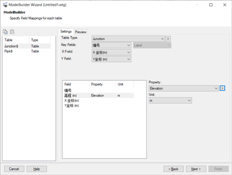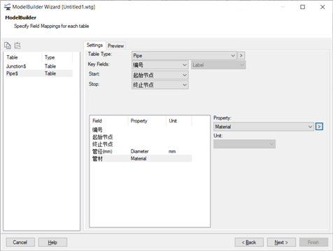 6)属性字段挂接。将excel节点和管道表中的字段分别与模型库中的节点和管道属性字段进行一一对应,对应过的字段会自动的导入模型数据库。这里注意字段里的数据需要与模型库的数据类型一致,比如坐标,管径管长为数值格式,管材标号为文本格式等。