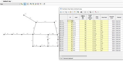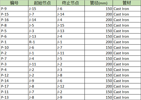在导入之前,需要准备Excel源数据,需要确保源数据里管网拓扑是正确的,数据是完整的(数据不完整也能导,导进去模型就是不完整的)。一般excel数据需要包括管道和节点两张表,表的格式如下所示,表头名称可以自定义。