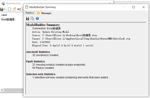 9)导入之后弹出提示框,可以看到导入的统计信息,如导入多少节点和管线,并创建选择组。