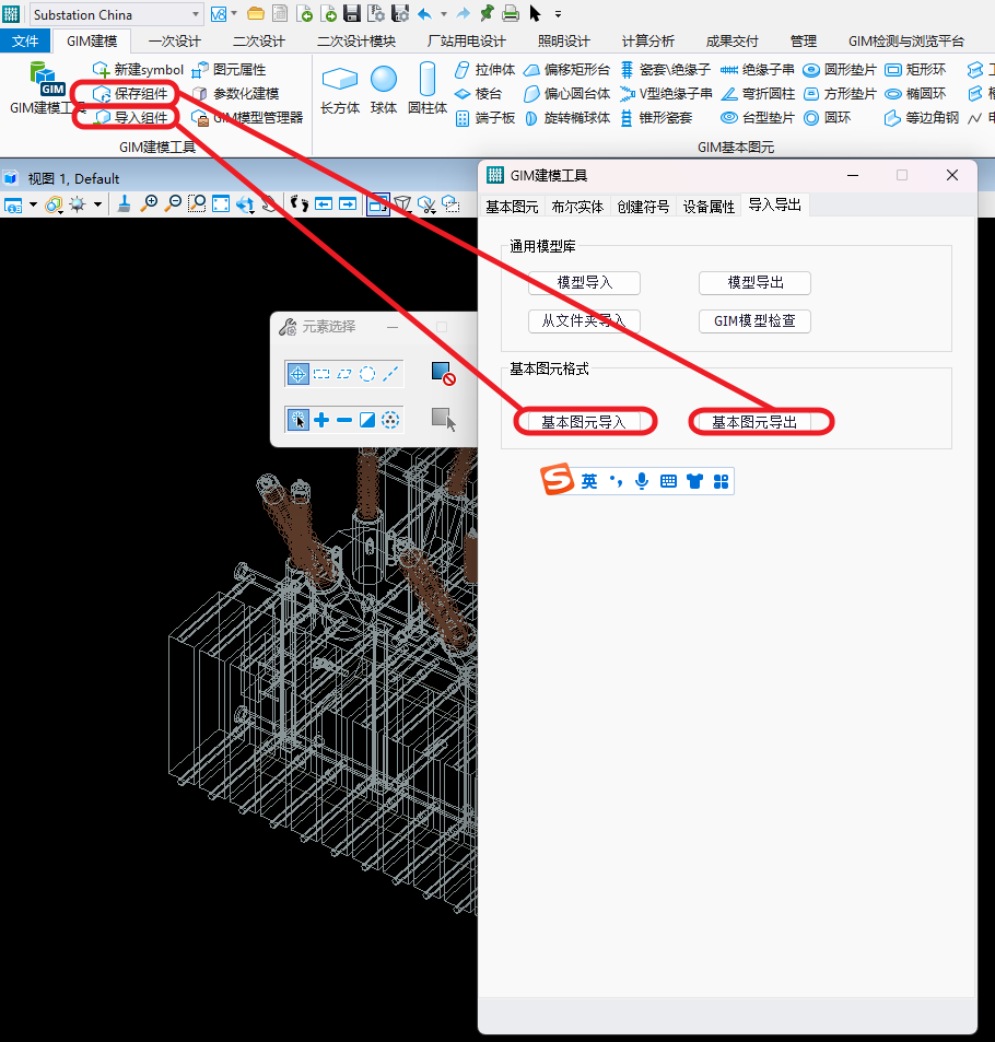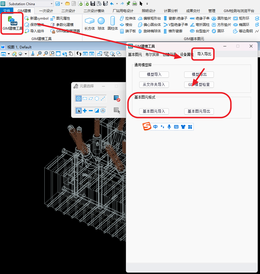 1.在gim建模工具中,在“导入导出”页面中可以看到基本图元格式功能部分,这里有两个按钮,分别为:
