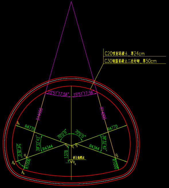 由于隧道洞身断面主要由圆弧构成,在横断面模板里主要用到的约束类型是角度-距离约束(Angel-Distance)。