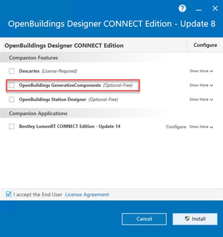 - For New installations: When installing OpenBuildings Designer (Or any Open Application) On the landing page of the install dialog, under Companion features, there is a check box for OpenBuildings GenerativeComponents.