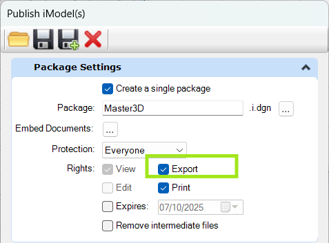 Make sure that "Export" rights are enabled when iModel is being published (Open file in MicroStation>File>Publish iModel>Enable "Export")