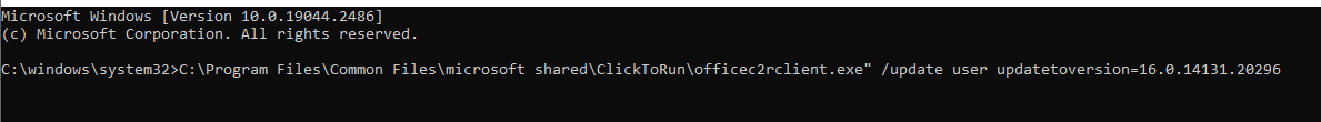 C:\Program Files\Common Files\microsoft shared\ClickToRun\officec2rclient.exe" /update user updatetoversion=16.0.xxxx.yyyy