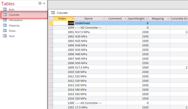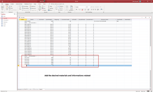 Step 3: After opening the file, in the Tables section on the left you will see multiple entries, but in this example we will select Concrete to add new materials under the concrete table.