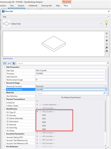 Step 5: After adding your materials, save the MDB file and then restart OpenBuildings Designer. Now when you place a slab, under the Structural | Material property you will be able to see the new materials.