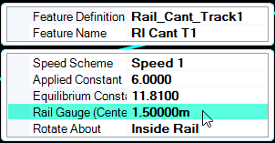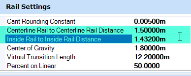 NOTE that if Design File Settings and cant don't have the same rail center to rail center distance, the gauge could be incorrect. If you change the Rail Center to Rail Center distance in the cant, existing rails gauge (Inside to inside) will change accordingly, no matter the Design File Settings at that time.