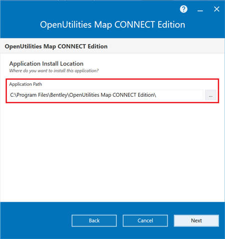 4. On this page, you will be able to tell the Installation Wizard where you want the application to be installed. By default, the application is installed in the following directory: C:\Program Files\Bentley\OpenUtilities Map CONNECT Edition\