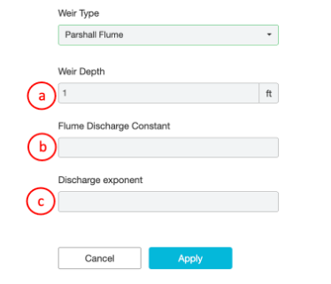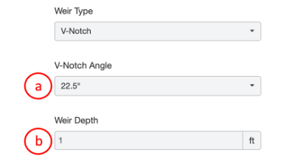 11. Weir Type- A dropdown that allows the user to select from the configured weir geometries. Weir types currently configurable are V-Notch, Rectangular, Round, and Parshall Flume.