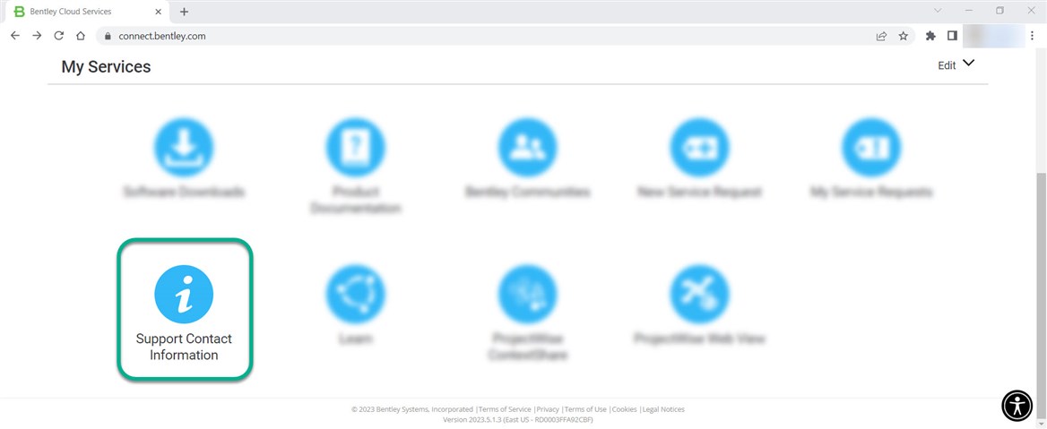 Note that you can always navigate to the Bentley Cloud Services portal, locate the My Services section at the very bottom and choose Support Contact Information tile from the available options.