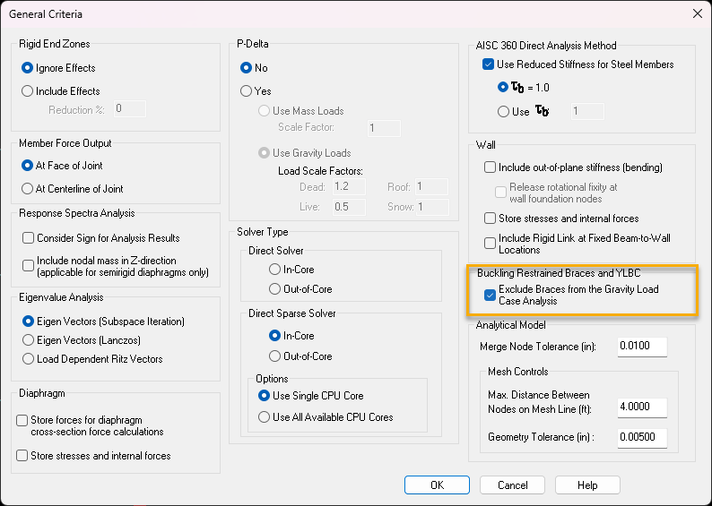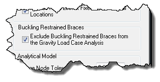 AISC 341-10 Section F4.3 states “Buckling Restrained Braced Frames shall not be considered as resisting gravity forces.” To accommodate this, an option has been added to Criteria – General to allow the user to specify that the braces are not to be included in the analysis of the gravity load cases.