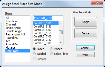 In Elevation View in the Modeler assign preliminary sizes to the braces. In the Layout – Braces – Assign Size command select CoreBrace from the list of Shapes, select the desired brace size, and select the connection type (Bolted, Welded, Pinned or Splice Plate).