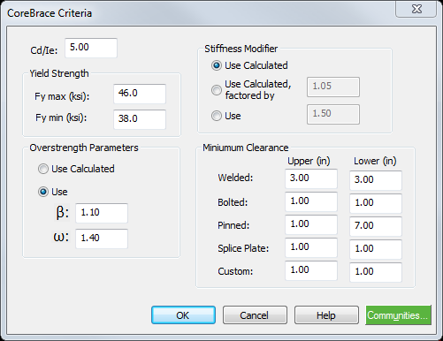 The Criteria applies to all CoreBrace Buckling Restrained braces. It is possible, however, to assign specific values to specific braces, on a brace-by-brace basis, using the Assign – Braces – Buckling Restrained – CoreBrace command.