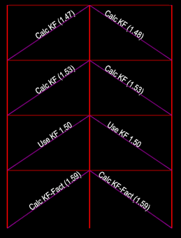The View – Members command can be used to view what has been assigned to each brace for the Stiffness Modifier, whether it is a calculated value or an assigned value. Select the Brace tab and select the Buckling Restrained labels option. If the program is using a calculated value the label will show “Calc KF” followed by the calculated value in parentheses. If the program is using a factored calculated value the label will show “Calc KF-Fact” followed by the factored calculated value in parentheses. If the program is using a user-specified value the label will show “Use KF” followed by the assigned value.