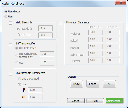 The Use Global option is merely for the purpose of clearing any specific previous assignments and resetting the brace to use the values set in the Criteria command. Note that it is not necessary to invoke this Assign command if all of the braces are to use the values specified in the Criteria – Buckling Restrained – CoreBrace command, which are considered to be the global values; they will automatically use the Criteria values unless something different is assigned with this command.