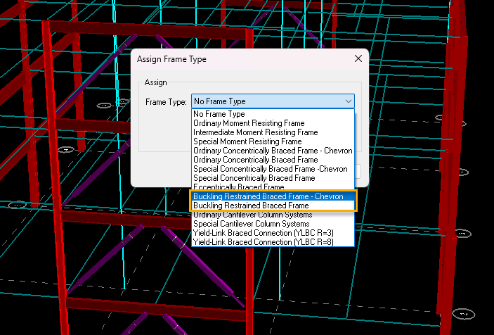 It is necessary to assign a frame type to each member, used by the program to determine which seismic provisions are pertinent. This is done using the Assign – Frame Type command. Select either Buckling Restrained Brace Frame or Buckling Restrained Brace Frame - Chevron as appropriate.