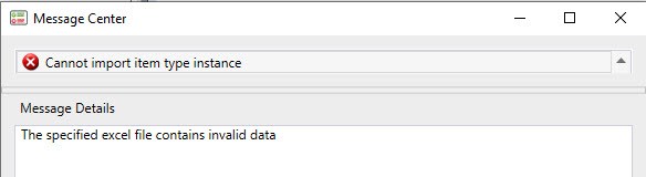 (Selecting the "Cannot import item type instance" displays further details, in this instance "The specified Excel file contains invalid data").