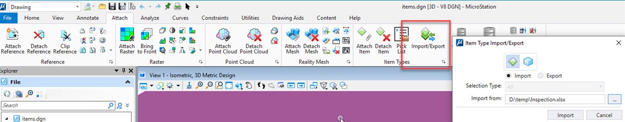 5. In MicroStation select the Import/Export Item Type tool and Import the corrected Excel files Instance data