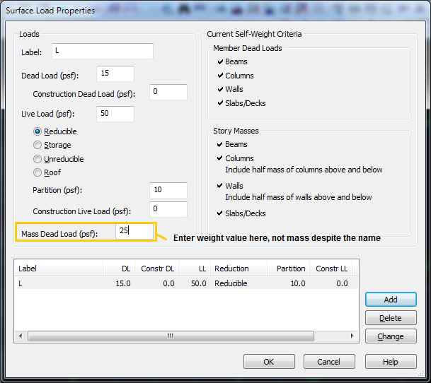 On the Loads and Applied Forces report, the "Total Building Weight" is reported. This value is the sum of the Mass Dead Loads considered in the seismic analysis which can include member and deck self-weight. This is also a weight term, not a mass.