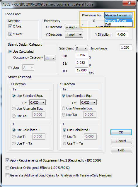 When creating a seismic load case using the IBC/ASCE7 equivalent lateral force procedure, there is an option to use provision for member forces or provision for drift (see screenshot below).