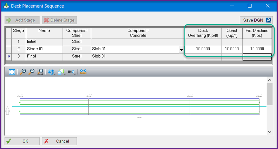 For example -- The DC load factor is applied to the deck load and the DW load factor is applied to the construction loads and the finishing machine loads.