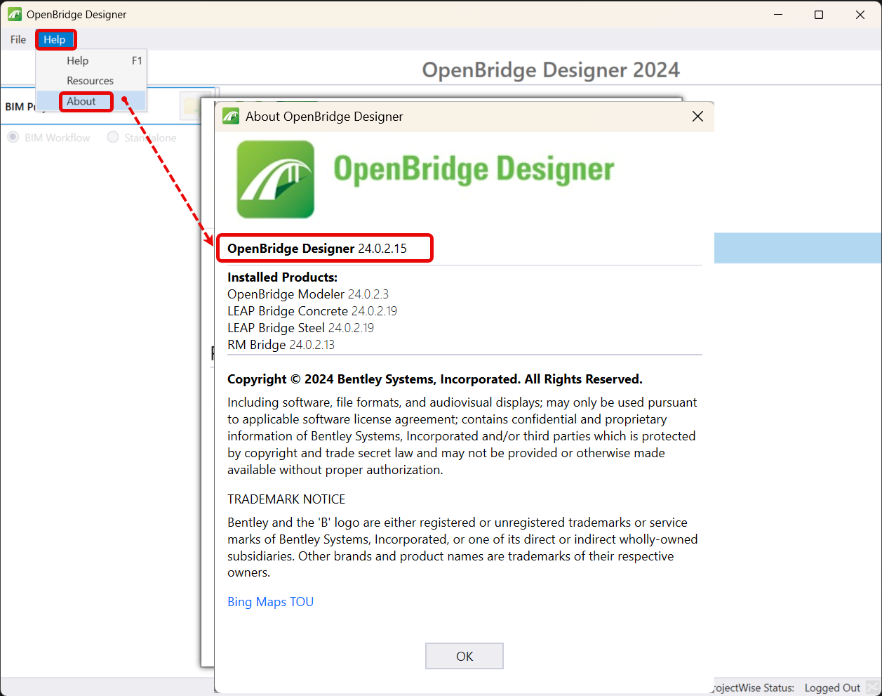 The release number of OpenBridge Designer as well as the release numbers of component modules can be found under File/About (see screenshot below).