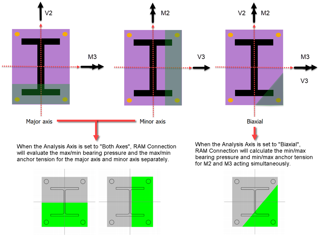 ANSWER: A linear model is used for the contact stresses calculation between a steel base plate and a concrete foundation. This is different from the "both axis" approach which evaluates the plate for major or minor axis moments individually (with axial).