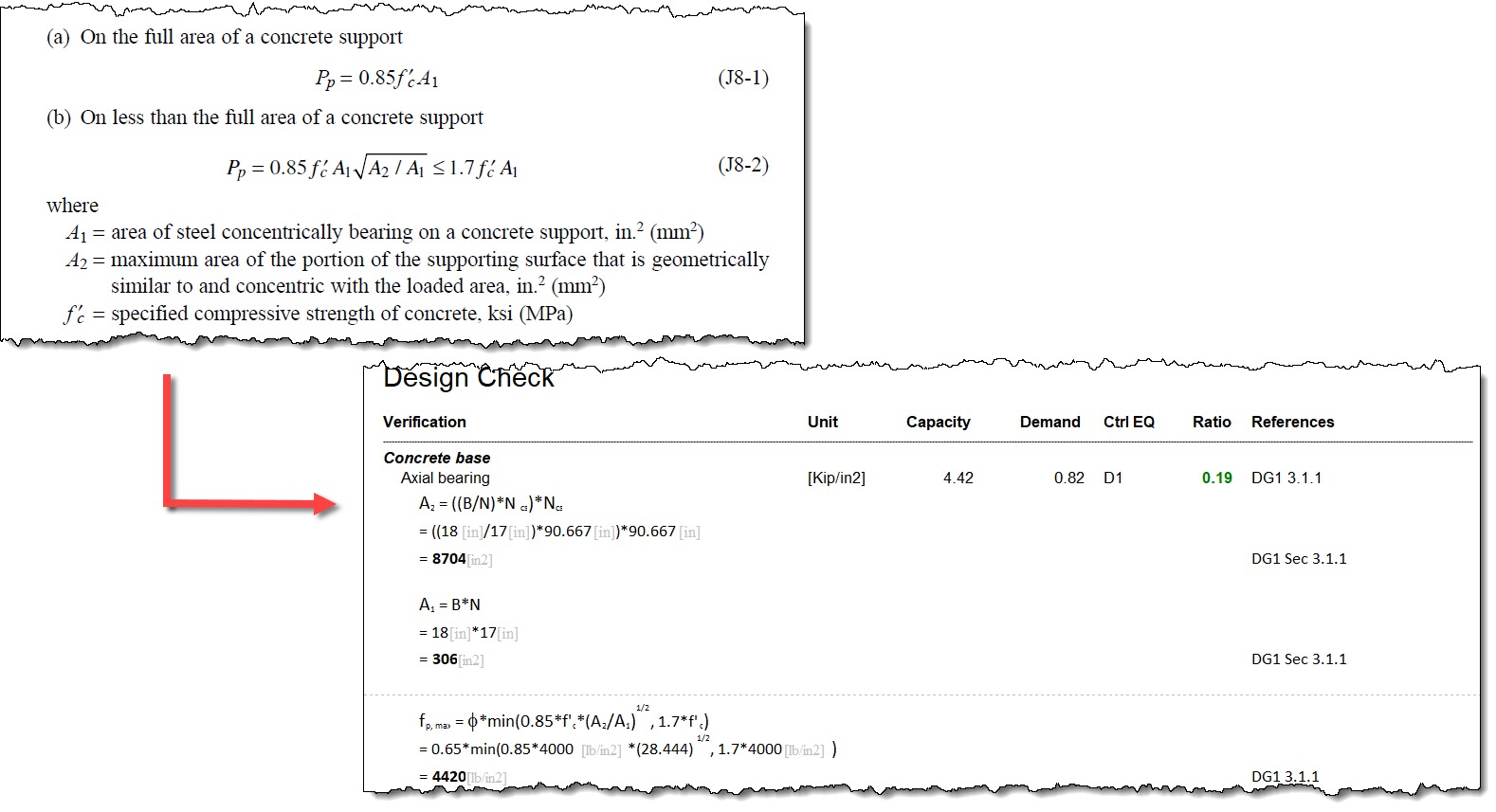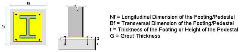 The ratio of A2/A1 will be calculated using the dimensions of the base plate along with the dimensions of the footing or pedestal. The pedestal, footing, and grout parameters are entered into the Connection Pad after the initial base plate is assigned. (These parameters can be found in the Base Plate > Support folder in the Connection Pad.)