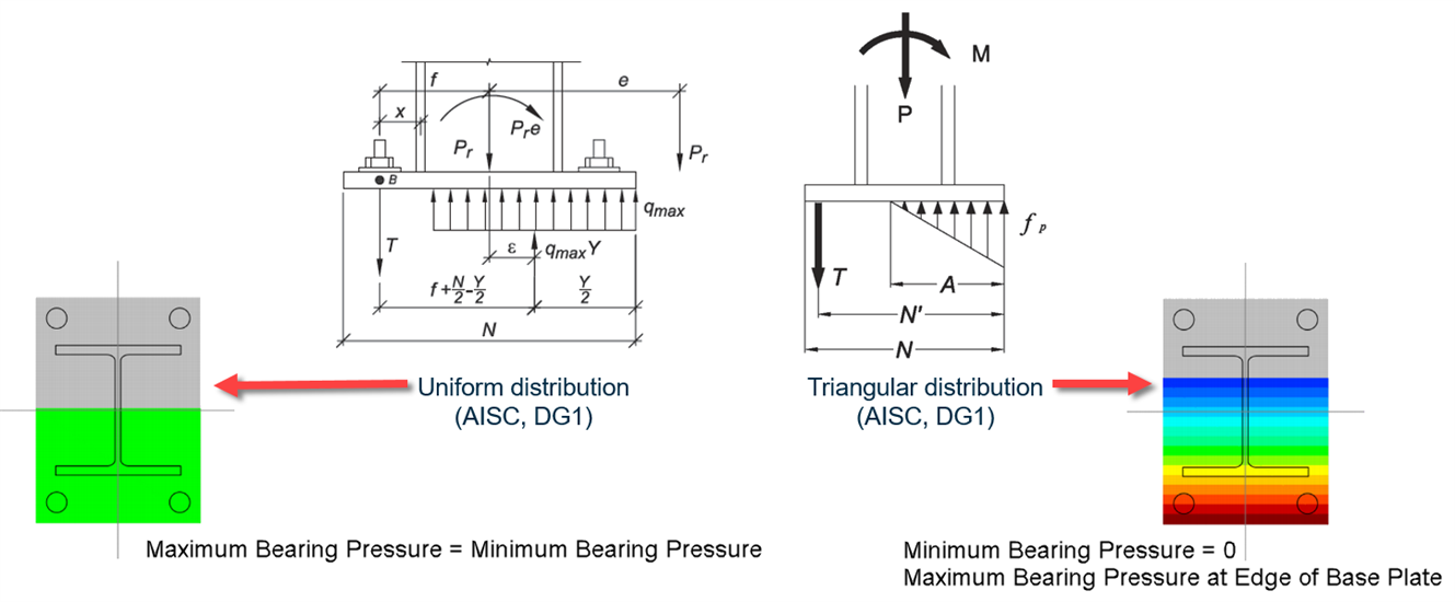 NOTE: For base plates designed according to the AISC 360, the uniform pressure distribution will be calculated according to the AISC Design Guide 1. The triangular pressure distribution will be calculated according to the AISC Design Guide 1, Appendix B (alternative method).