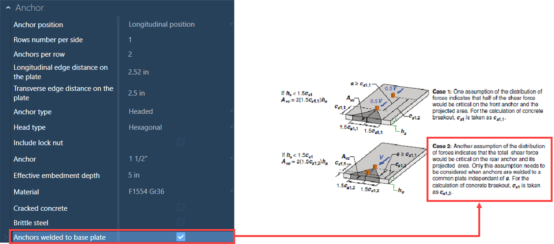 ANSWER: Anchors welded to the base plate will be considered in the design if this option is selected in the connection pad. If this option is selected, the anchor/group of anchors that are farthest from the concrete edge will be considered as critical during the design in accordance with the ACI 318-19, Figure R17.7.2.1b.