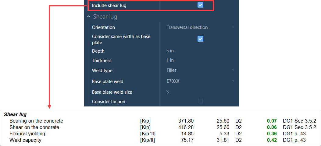 The option to include a shear lug can be selected in the Connection Pad, along with the Shear Lug parameters. The capacity of the shear lug will then be calculated and the anchor bolts will not transfer the shear from the base plate to the support.