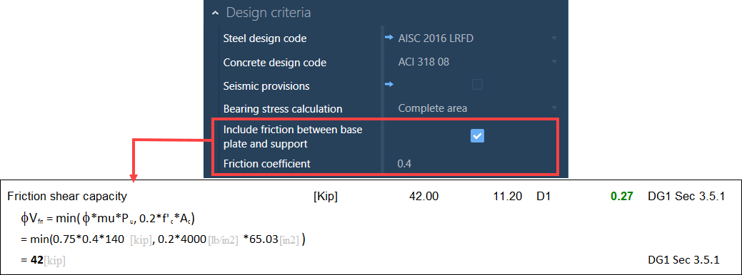 The option to include the friction between the base plate and support can be selected in the Connection Pad. The friction shear capacity will then be calculated, and the anchor bolts will not transfer the shear from the base plate to the support.