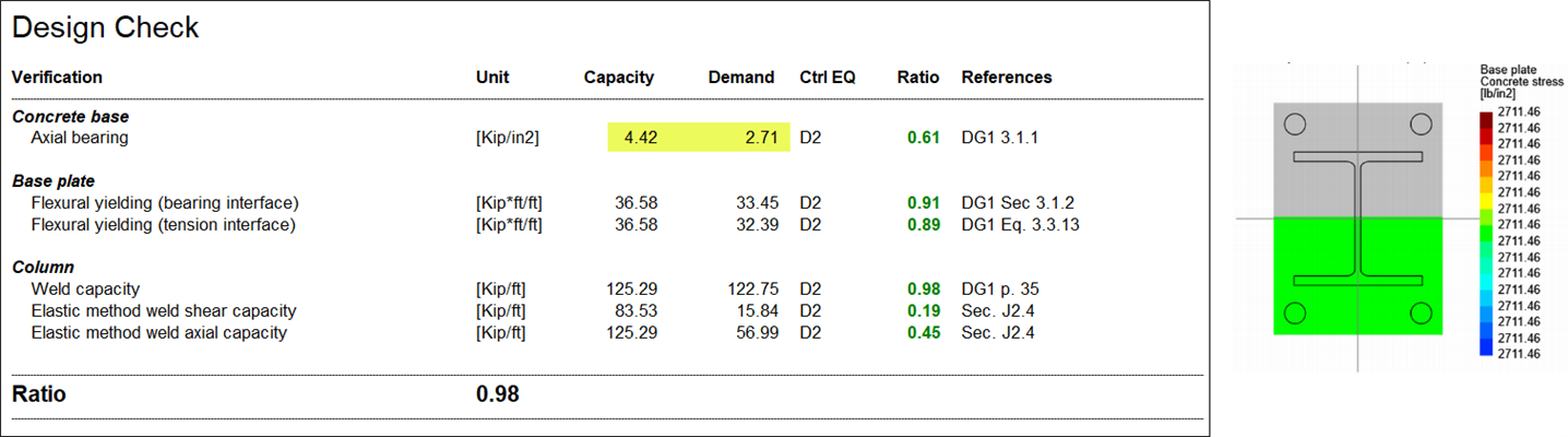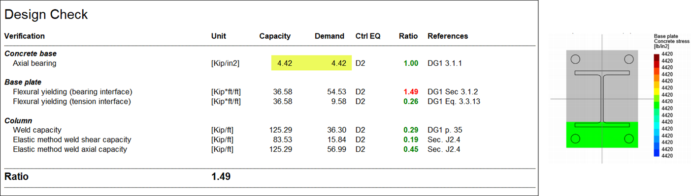 To modify the design to be more conservative, without modifying the support dimensions, the calculated A2/A1 area ratio for the bearing stress calculation can be overridden in the Connection Pad after the initial base plate is assigned. (The Override A2/A1 Ratio parameter can be found in the Base Plate > Base Plate folder in the Connection Pad.)