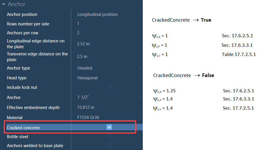 ANSWER: Cracked concrete can be selected in the Connection Pad after the initial connection is assigned. The cracked concrete parameter will affect the modification factors as follows: