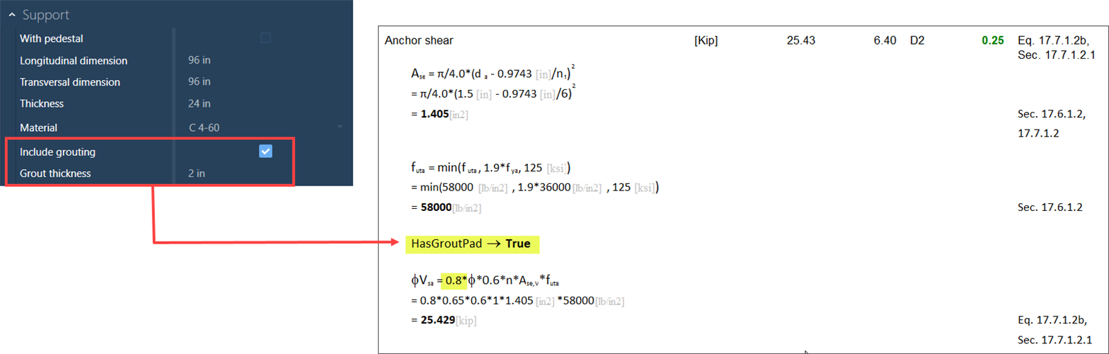 ANSWER: Yes. You can choose to include grouting in the Connection Pad after the initial connection is assigned. This parameter will affect the shear capacity of the anchor bolts: