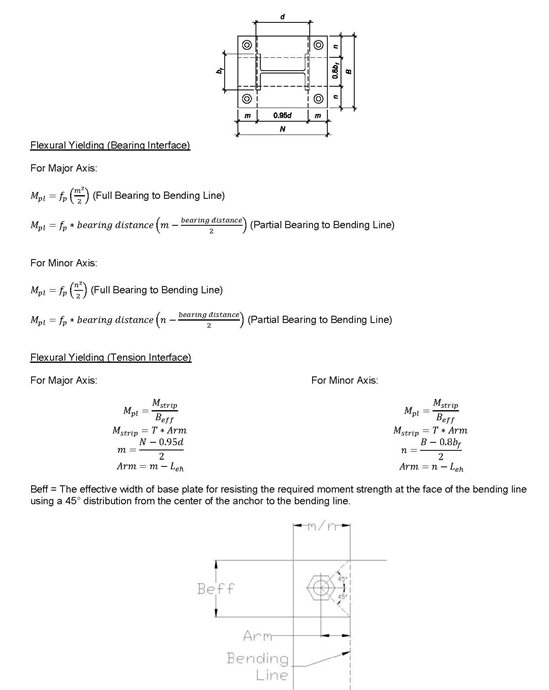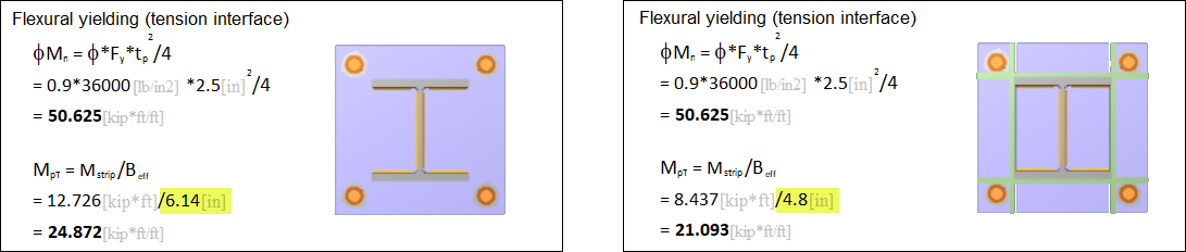 ANSWER: The demand on the flexural yielding at the tension interface (Mpt) of the base plate is calculated considering the tension at the anchors over an effective width (Beff). For large base plates, or base plates with significant tension on the anchors, stiffeners can help to reduce the controlling effective width: