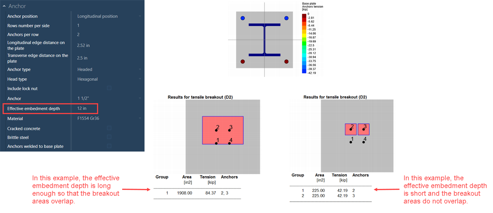 ANSWER: The total embedment length of the anchors is equal to the effective embedment depth plus the bolt/anchor head size. The effective embedment length is entered into the Connection Pad. The bolt/anchor head size is 0.65 x diameter of the bolt. The effective embedment length of the anchor bolts will affect the tensile breakout calculations, as seen in the figure below: