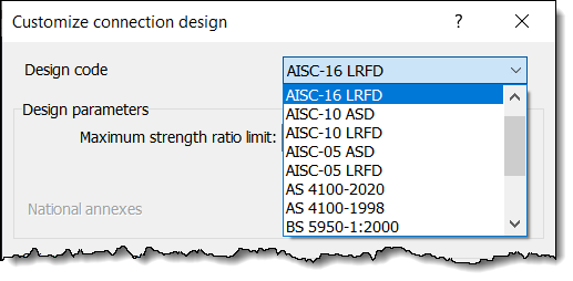 The design code is selected in the Customize Connection Design dialog: