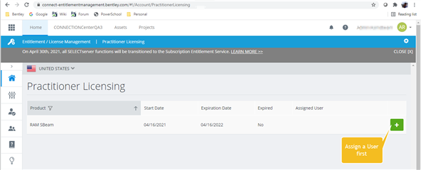 RAM SBeam CONNECT Edition Version 7 requires a Practitioner License to run beyond the trial period. This can be purchased through a Virtuoso Subscription here. For E365 accounts, RAM SBeam will be available as a standalone product at a daily rate. The following Administrator steps can be used to Assign the Practitioner License to a specific user.