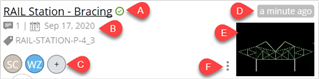 E: Thumbnail of the session. When you first create a session, this would be a blank placeholder. The thumbnail of the design review session is automatically retrieved from the view extracted from the first comment entered in the iTwin Design Review session.