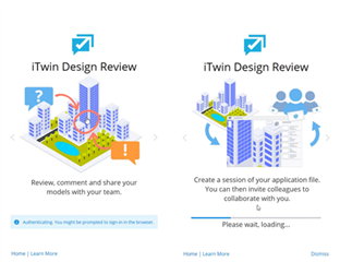 Figure 5 - iTwin Design Review authentication splash screen and subsequent loading page. Click Home to return to iTwin Services page.
