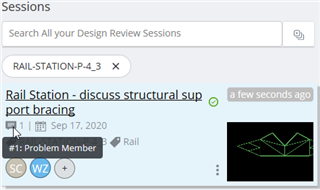Sessions List: Displays a flat list of your iTwin Design Review sessions. The Session List view can be searched and filtered by tags. Tags are added during iTwin Design Review session creation process. The sessions list would initially be prefiltered to your current file Tag (usually the currently opened file name). This is so that the sessions list would be most relevant to your currently opened file. Remove the session Tag by clicking the “x” next to the filtered tags to view all you design review sessions.