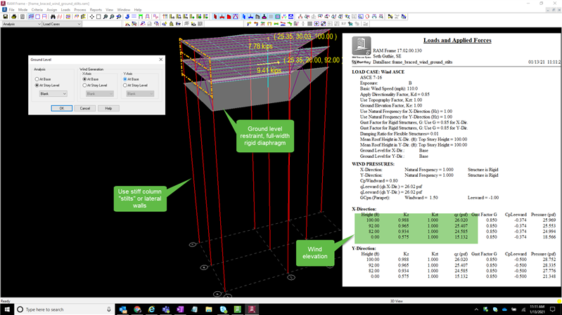 Additionally, when the diaphragm is semirigid, this can affects the building natural frequency which, in turn, can affect the wind gust factors and pressures and total forces. It may be better to manually input the structure frequency when using semirigid diaphragms.